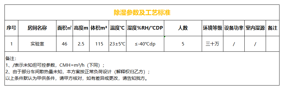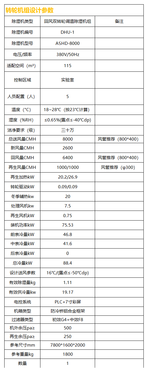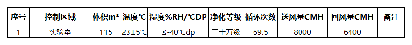 本項目含超低露點區域一個,各房間設計送風量取降溫、除濕、潔凈三者所需風量的最大值;實驗室要求露點溫度≤-40℃dp,人數5個,送風露點≤-50℃dp,濕差為0.077g/kg,人均散濕量為120g/h,空氣密度取1.2,則所需風量Q=120/0.077/1.2*5≈6500CMH,安全系數1.2,送風量為6500*1.2≈8000CMH;
