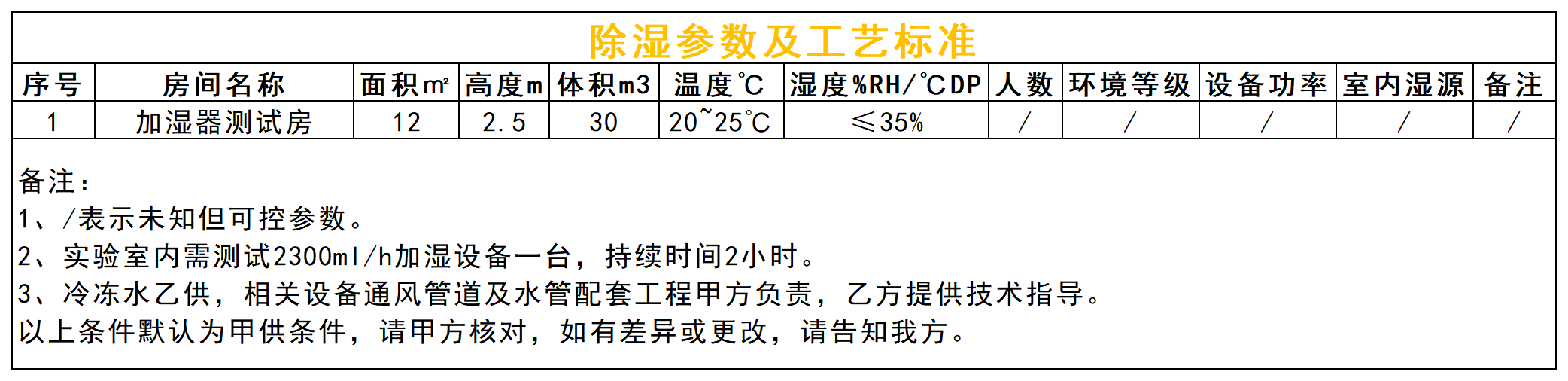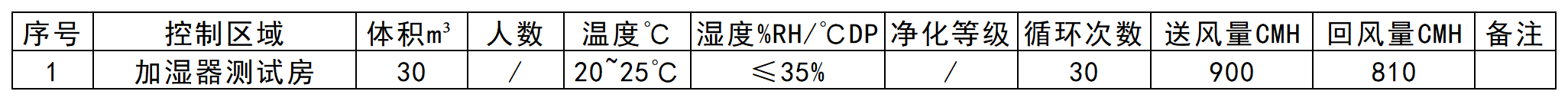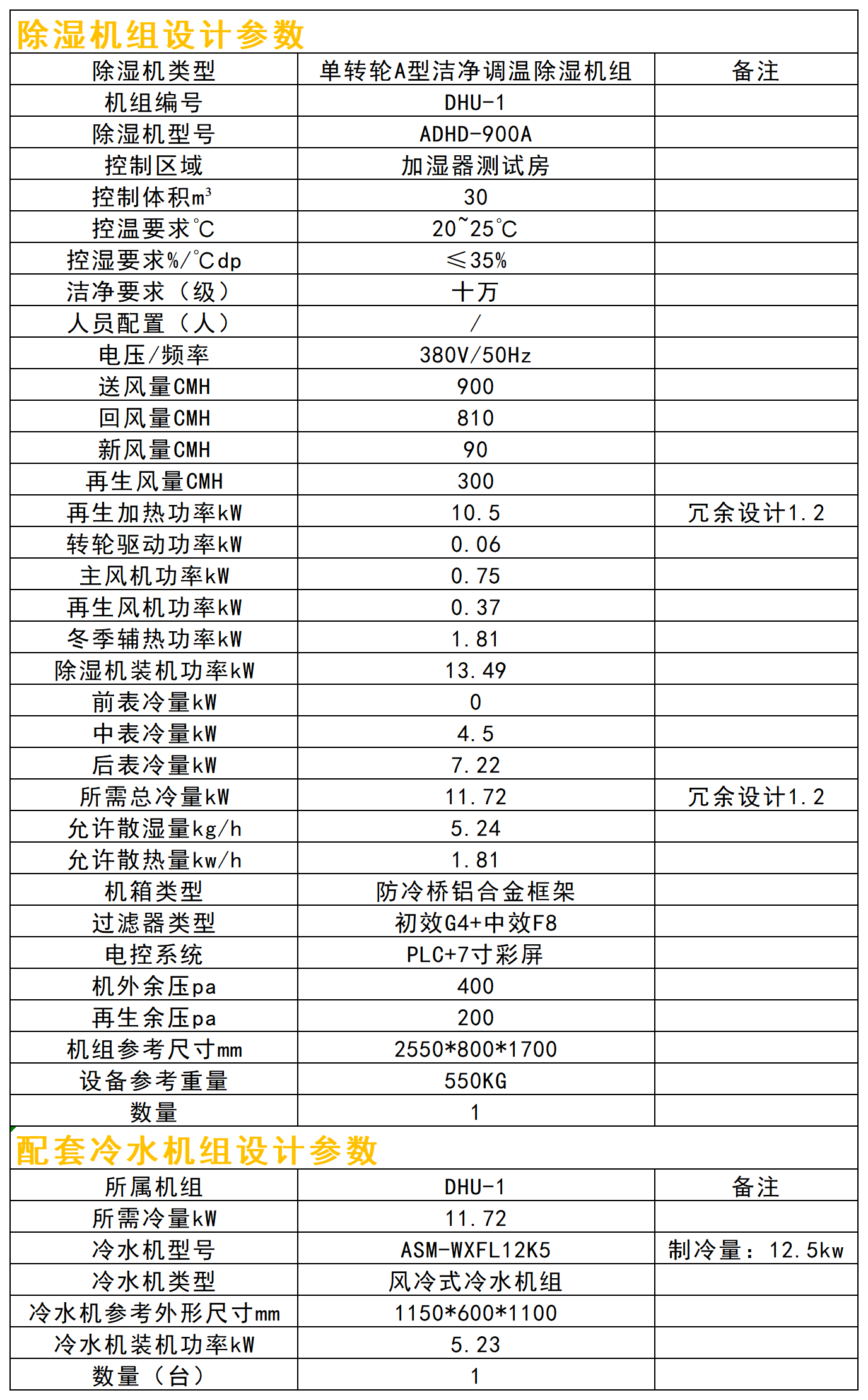 本方案除濕區域含:加濕器測試房一個區域,其域內要求1臺2300ml/h加濕器加濕的工況下,溫度控制在20~25℃,濕度35%(含濕量6.17g/kg干,25℃),取送風濕度35%(含濕量3.98g/kg干,16℃)作為送風參數,計算機組送風量Q=1*2300/(6.17-3.98)/1.2=875,可設計機組送風量為900CMH,取送風量10%作為系統新風量,回風量810CMH的單轉輪除濕機組控制,送風含水量≤3.98g/kg。