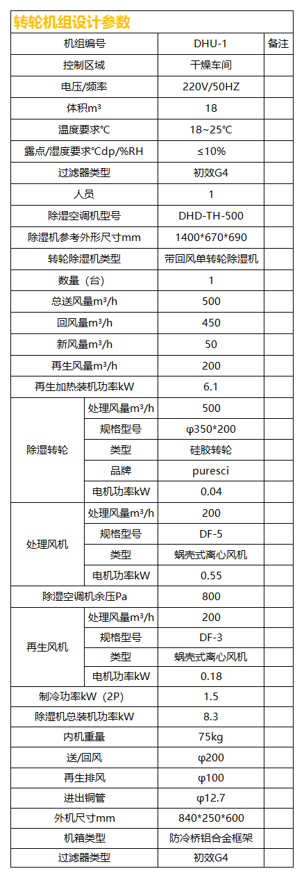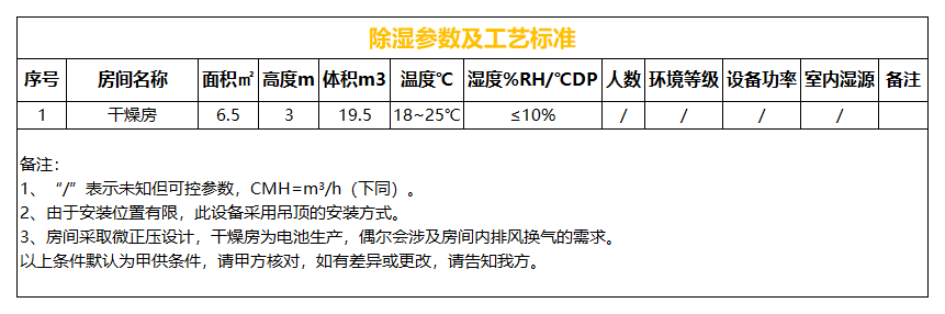 本方案除濕區(qū)域含:干燥區(qū)一個,基于甲供參數(shù)表及設(shè)計(jì)選型依據(jù),該區(qū)域采用一臺送風(fēng)量500CMH單轉(zhuǎn)輪除濕機(jī)組控制。