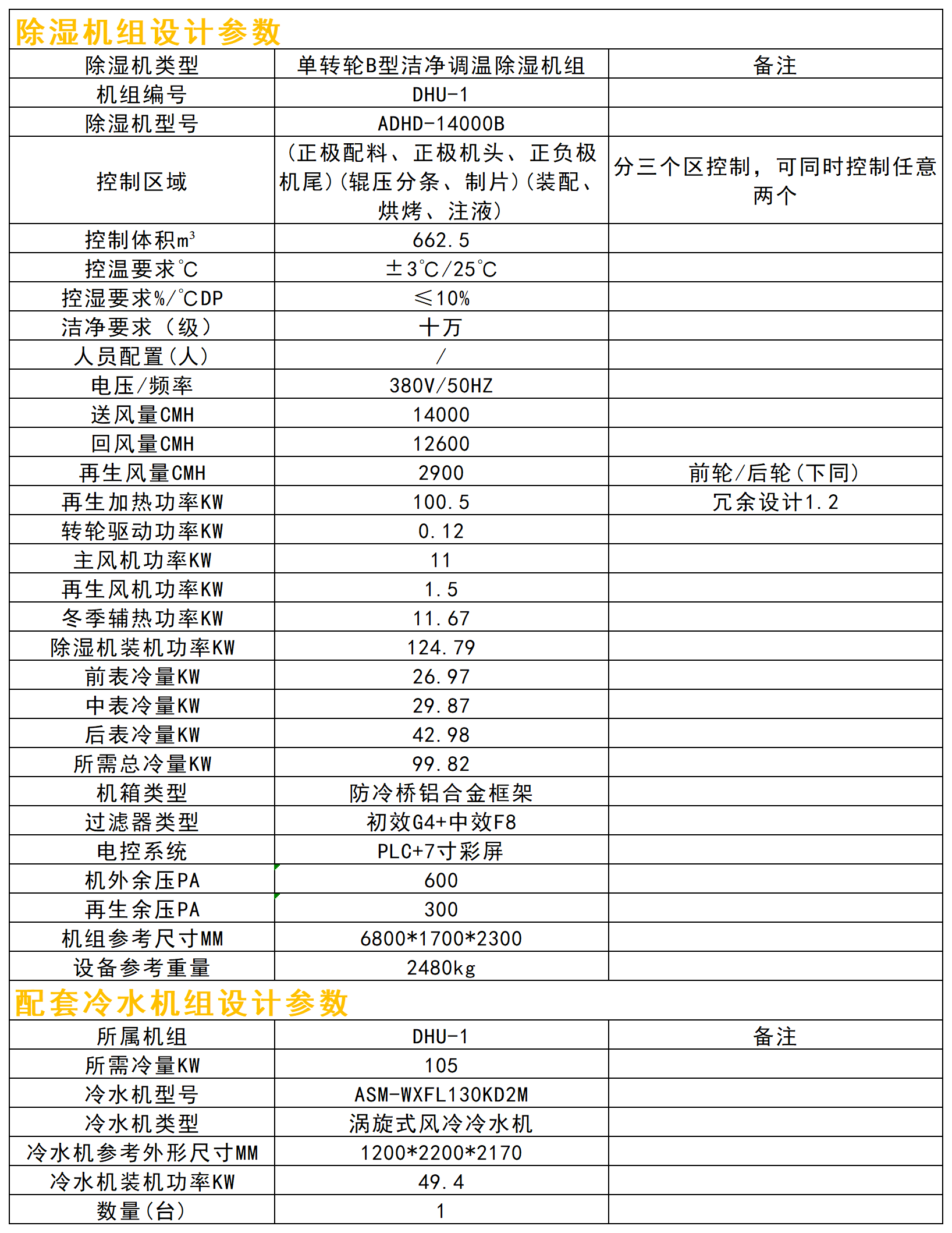 本項(xiàng)目除濕區(qū)域一共分成三個(gè)區(qū),需滿足任意兩個(gè)區(qū)同時(shí)使用,則應(yīng)取兩個(gè)最大區(qū)的送風(fēng)量之和作為機(jī)組的額定風(fēng)量,所以機(jī)組設(shè)計(jì)風(fēng)量為14000CMH,回風(fēng)量為12600CMH。