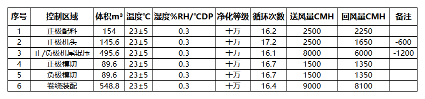 本項目含除濕區域干燥房和投料房,機組風量需同時滿足域內除濕,降溫,潔凈要求,三者取最大值為機組送風量;房間無大型散熱設備,換氣按 16 次設計,新風量取 10%,機頭機尾吸風按600CMH/口計算。