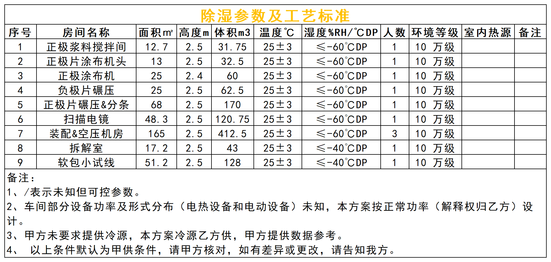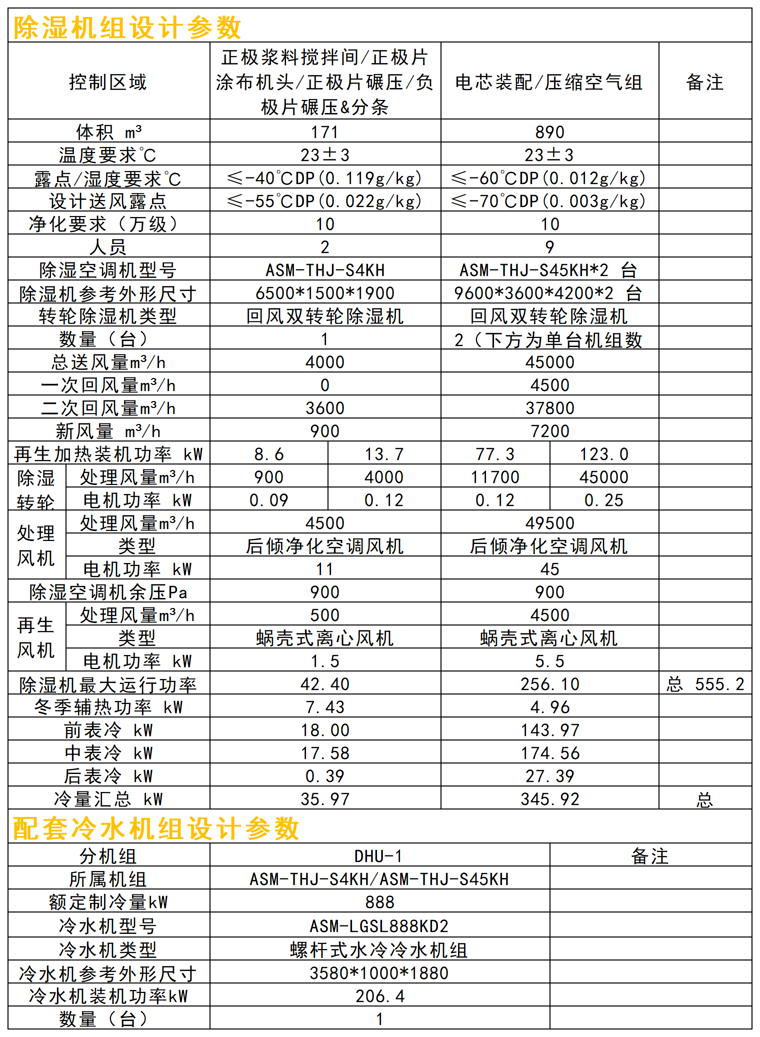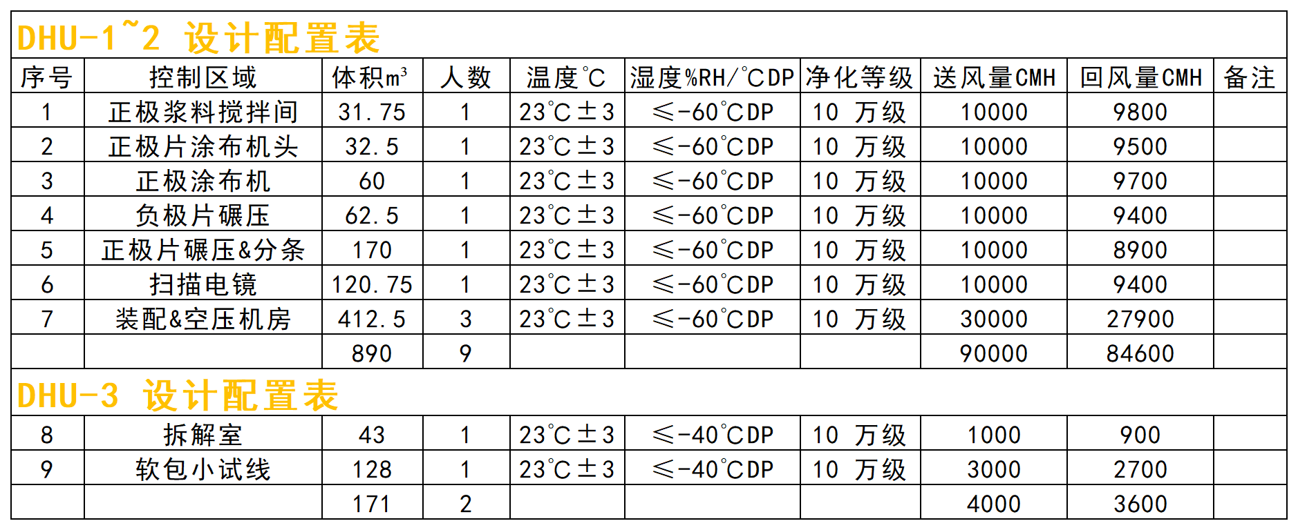 本項(xiàng)目除濕區(qū)域含正極漿料攪拌間、正極片涂布機(jī)頭、正極涂布機(jī)、正極片碾壓&分條、負(fù)極片碾壓、電芯裝配、壓縮空氣機(jī)房、3 樓拆解室、4 樓軟包小試線 9 個(gè)區(qū)域,分為≤-40℃DP(0.119g/kg)和≤-60℃DP(0.012g/kg)兩個(gè)濕度梯隊(duì),基于甲供參數(shù)及設(shè)計(jì)選型依據(jù),正極漿料攪拌間、正極片涂布機(jī)頭、正極片涂布機(jī)、正極片碾壓&分條、負(fù)極片碾壓、掃描電鏡、裝配間及空壓機(jī)房設(shè)計(jì)送風(fēng)露點(diǎn)≤-70℃DP(0.003g/kg),其送風(fēng)量 90000CMH,回風(fēng)量84600CMH,新風(fēng)量 14400CMH 的雙轉(zhuǎn)輪除濕機(jī)組控制,由于受轉(zhuǎn)輪大小限制,此區(qū)域分兩臺45000CMH 機(jī)組 DHU-1~2 控制;3 樓拆解室及 4 樓軟包實(shí)驗(yàn)室兩個(gè)區(qū)域設(shè)計(jì)送風(fēng)露點(diǎn)≤-55℃DP(0.022g/kg),其送風(fēng)量 4000CMH,回風(fēng)量 3600CMH,新風(fēng)量 900CMH 的雙轉(zhuǎn)輪除濕機(jī)組 DHU-3控制。